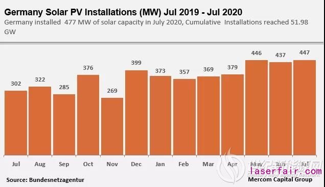 近日了解到,根據(jù)德國(guó)聯(lián)邦網(wǎng)絡(luò)機(jī)構(gòu)Bundesnetzagentur公布的最新數(shù)據(jù),德國(guó)在2020年7月安裝了447兆瓦太陽(yáng)能容量,比2020年6月增加了11兆瓦(增長(zhǎng)2.2%)。去年同月,德國(guó)安裝了302兆瓦。