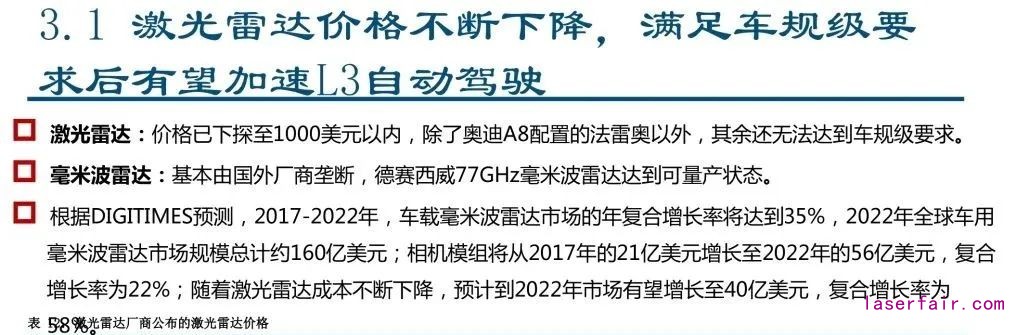 中信建投研報指出,激光雷達價格已下探至1000美元以內(nèi),預計到2022年市場有望增長至40億美元,復合增長率為58%。
