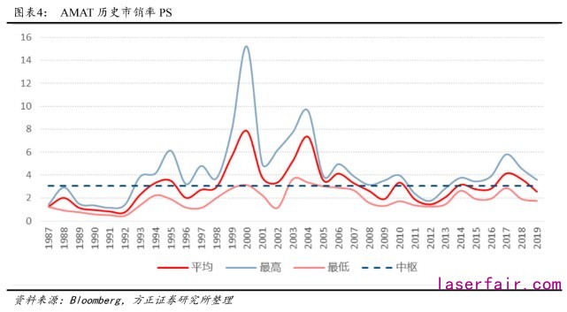 當公司處于內(nèi)生、外延等高速發(fā)展階段時,行業(yè)高景氣度(BB值大于100%),公司PS估值將會有更高溢價。從應(yīng)用材料1987-2019年的PS估值來看,2000年2004年的峰值分別達15.2X與9.6X,2007年后隨著業(yè)務(wù)成熟,估值逐步趨于平穩(wěn),2017年后的估值中樞約2.7X,2017年峰值曾達5.8X。整體來看,1987-2019年公司PS估值中樞為3.04X。從泛林集團1987-2019年的PS估值來看,其PS估值歷史中樞為2.28X,其中2000年與2004年的峰值分別達到9.8X與5.9X。2007年后,公司估值波動性亦有所下降。