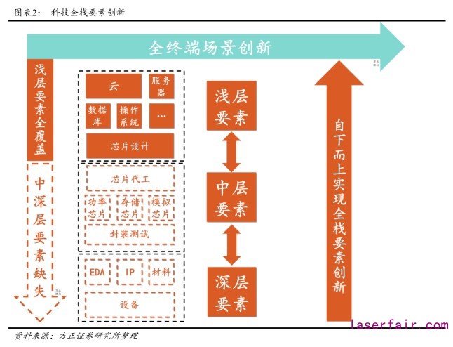 2.硬科技,要素創(chuàng)新:是科技發(fā)展的底層源動力,是一種縱向的探索式創(chuàng)新,從上往下依次劃分為三個層級,分別是:淺層要素(云、系統(tǒng)軟件、服務(wù)器、芯片設(shè)計)、中層要素(代工、封測、制造、存儲)、深層要素(芯片設(shè)備、材料、IP、EDA),而這三層硬科技歸根結(jié)底來源于數(shù)學(xué)、物理、化學(xué)、材料等基礎(chǔ)科學(xué)。對于技術(shù)邊界的拓展,這些基礎(chǔ)設(shè)施背后的要素創(chuàng)新,自上而下,層次越深,難度越大,中國與國外的差距也越大。