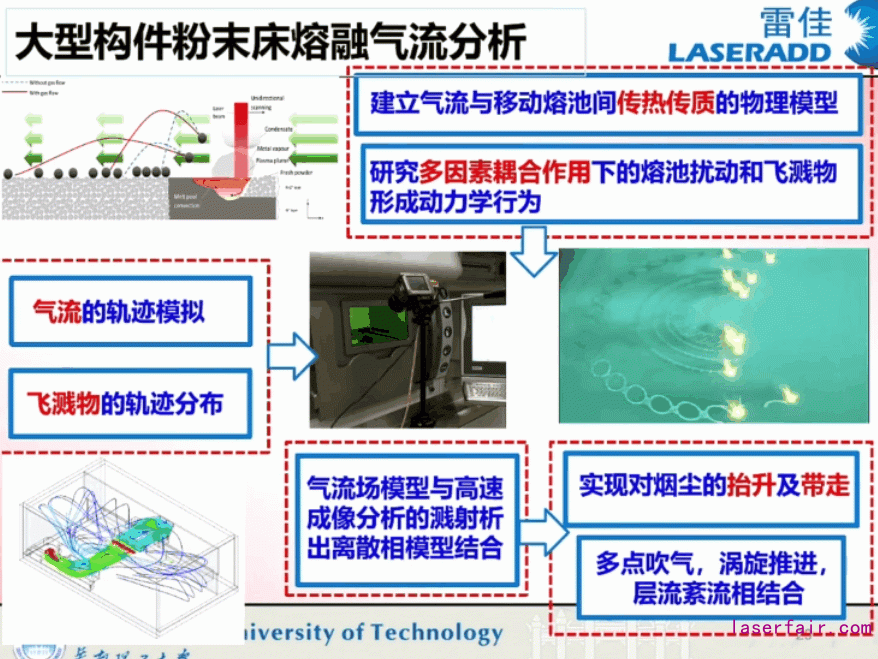 多激光大幅面打印機(jī)面臨的一個(gè)最大問(wèn)題是氣流和風(fēng)場(chǎng)的問(wèn)題,打印過(guò)程中的煙塵和飛濺難以避免,在多激光情況下將更加嚴(yán)重,氣流場(chǎng)流道的結(jié)構(gòu)設(shè)計(jì)、處于成型腔內(nèi)的位置、進(jìn)出氣流的大小,都將對(duì)材料的成型質(zhì)量控制產(chǎn)生不同的影響,這是該技術(shù)普遍性的問(wèn)題,楊永強(qiáng)教授團(tuán)隊(duì)有專門(mén)的博士生在從事該方面的工作。