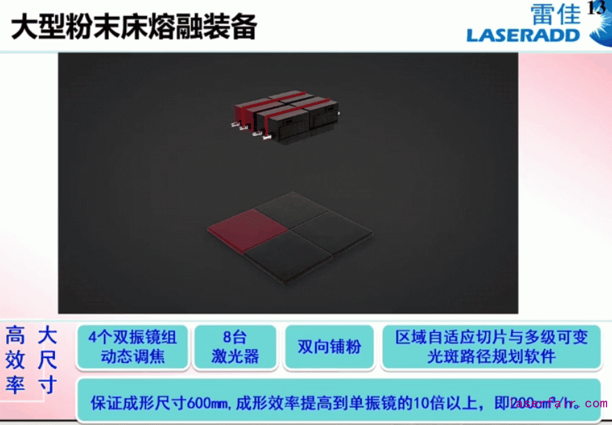 把打印尺寸做大,在保證精度的前提下提高效率,增加振鏡和激光的數(shù)量在目前是比較有效的辦法。通過(guò)簡(jiǎn)單振鏡拼接方式來(lái)提高打印幅面可以將打印尺寸提高到600mm以上,然而通過(guò)2振鏡或4振鏡協(xié)同實(shí)現(xiàn)的全幅面打印,尺寸會(huì)局限在300-400mm;4振鏡拼接打印效率提升有限,不足四倍;9振鏡拼接的搭接面太多。