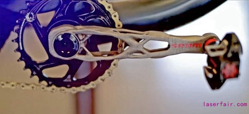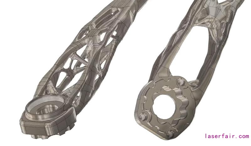 3D 打印的鈦合金原型產(chǎn)品利用了選擇性激光燒結(jié)增材制造技術(shù)。那些聚焦的激光實(shí)際上將鈦粉壓實(shí)并硬化成固體結(jié)構(gòu)。從徑向支撐結(jié)構(gòu)(左上方)開始,一次只覆蓋一小層,直到完成了完整的曲柄臂結(jié)構(gòu)(右上方)。