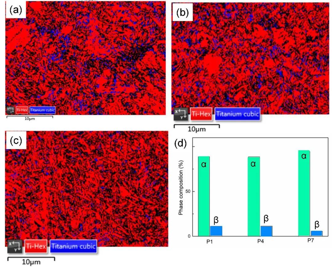 圖3 激光立體成形制備的熱處理態(tài)Ti-Mo樣品中α-hcpTi和β-bccTi的分布和形態(tài)(a)P1-top;(b)P4中間;(c)P7底部區(qū)域;(d)相組成統(tǒng)計(jì)數(shù)據(jù)