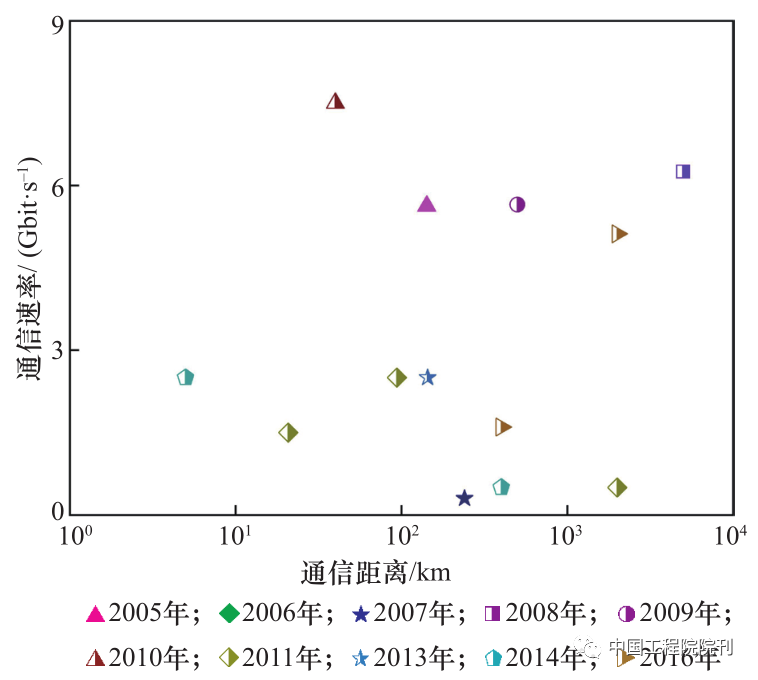 我國空間激光通信技術的研究進展如下。2007年,我國首次完成了動中通空間激光通信試驗,突破了雙動態(tài)光束瞄準跟蹤技術,傳輸速率達300 Mb/s,并逐漸將速率提高到1.5Gb/s、2.5 Gb/s、10 Gb/s,陸續(xù)開展了空地、空空等鏈路的演示驗證;2013年完成了兩架固定翼飛機間遠距離激光通信試驗,傳輸速率為2.5 Gb/s,距離突破144 km,超過了歐洲、美國等國家和地區(qū)同類型演示驗證的最遠距離。2011年,通過“海洋二號”衛(wèi)星開展了我國首次星地激光通信鏈路的數(shù)據(jù)傳輸在軌測試,最高下行速率為504 Mb/s。2017年,利用“墨子號”量子科學實驗衛(wèi)星開展了我國首次星地高速相干激光通信技術在軌試驗,最高下行速率達到5.12 Gb/s。2017年,搭載“實踐十三號”高通量衛(wèi)星的星地激光通信終端開展的我國首次高軌衛(wèi)星對地高速激光雙向通信試驗取得成功,40 000km星地距離最高速率為5 Gb/s。這些空間通信試驗在系統(tǒng)設計、捕獲跟蹤技術和光波的大氣傳輸特性等方面為我國空間激光通信技術的研究提供了寶貴的經(jīng)驗。
