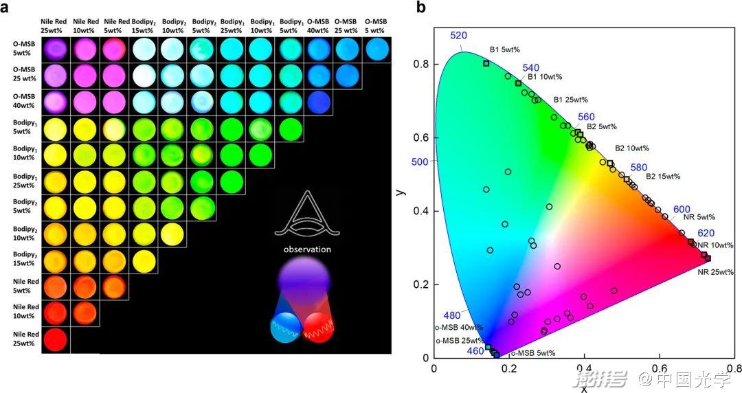 圖1: 不同拓?fù)浣Y(jié)構(gòu)液晶球生成的激光頻譜及光纖光流體彩虹激光器的示意圖通過對這12個(gè)不同激光波長,即12種特殊顏色的液晶球進(jìn)行組合可實(shí)現(xiàn)高色域覆蓋度的全彩激光器。如圖2所示,研究者在具有不同拓?fù)浣Y(jié)構(gòu)的RGBY四種顏色的液晶球中任選兩球進(jìn)行組合,355nm的紫外泵浦源可以同時(shí)激發(fā)兩個(gè)不同顏色不同結(jié)構(gòu)的液晶球,得到相對應(yīng)的光譜顏色,并將光譜信息轉(zhuǎn)化為CIE色度圖上的坐標(biāo)點(diǎn),與人眼能夠捕捉到的顏色一一的對應(yīng)。