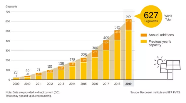 隨著電池轉(zhuǎn)換效率的提升,光伏發(fā)電的市場競爭突顯,自2019年光伏實現(xiàn)平價化,光伏產(chǎn)業(yè)迎來春天,從硅料到硅片、電池、組件各個產(chǎn)業(yè)鏈條不斷擴產(chǎn),2019年全球新增可再生發(fā)電裝機容量200GW,其中115GW為光伏,光伏發(fā)電貢獻率接近世界電力需求的3.0%,歐盟接近5%。