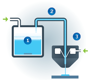 在霧化器里注入納米漿料,加入超聲和氣場霧化漿料成氣溶膠,霧化后的漿料(顆粒粒徑3-5微米)通過傳輸裝置過濾后到噴頭,噴嘴兩側(cè)加有氣場,噴出的漿料不會(huì)接觸噴頭,噴頭到基板的距離可調(diào)節(jié)在1-5毫米,直接在3D基板上噴印。