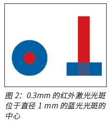 如此看來,單獨(dú)使用藍(lán)光激光或紅外激光都無法在銅的深熔焊中兼顧技術(shù)和經(jīng)濟(jì)上的優(yōu)勢(shì),這促使Laserline二極管激光專家嘗試另一種方法。不依賴于單一藍(lán)光或者紅外激光,Laserline研發(fā)了全新的復(fù)合焊。將LDMblue的藍(lán)光二極管激光與傳統(tǒng)LDM紅外激光通過特殊聚焦鏡片整合成一束激光(圖1)。其中,直徑1mm的藍(lán)光光斑中心覆蓋有直徑0.3mm的紅外光斑(圖2)。當(dāng)然,兩束激光也可根據(jù)需求分別使用,在加工同一部件時(shí)也可分別使用藍(lán)光及紅外激光(圖3)。