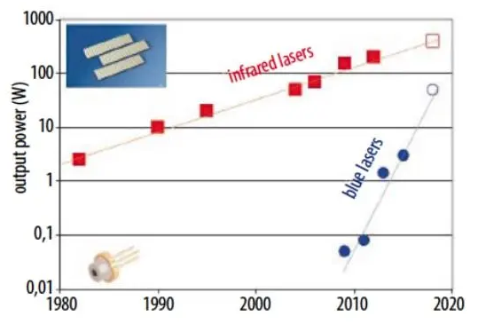 應(yīng)用于材料加工的激光光源發(fā)展迅速。全新藍(lán)光激光棒的光功率可以高達(dá)100瓦。紅外激光棒可實現(xiàn)以前被認(rèn)為幾乎無法企及的效率。大功率激光二極管作為材料加工激光系統(tǒng)的光源正在發(fā)揮著越來越重要的作用。紅外激光棒具有極高的光功率,其功率和效率目前已達(dá)到一個全新水平。另外,值得注意的是藍(lán)光波長激光棒,其在實驗室中的光功率可達(dá)100瓦(W)。這是一個巨大飛躍,因為不到十年前,藍(lán)光激光二極管只有幾瓦的功率。高功率密度令激光輻射成為一種高效的工具,可以將定量的能量傳輸?shù)焦ぜ囟▍^(qū)域,并在非接觸的情況下對這些區(qū)域進(jìn)行精確加熱。典型的應(yīng)用包括各種金屬和塑料的雕刻、涂層、焊接和切割等。根據(jù)VDMA 2019的《激光技術(shù)世界》統(tǒng)計,目前用于金屬切割和焊接的大功率激光工具占據(jù)了全球材料加工激光系統(tǒng)45%左右的市場份額。目前,大功率半導(dǎo)體激光器的應(yīng)用也越來越廣泛,它既可直接用作激光加工工具,也可以用于泵浦光纖或固態(tài)激光器。與二氧化碳激光器或閃光燈抽運固態(tài)激光器相比,它的效率更高,結(jié)構(gòu)更緊湊。其核心是半導(dǎo)體激光二極管,通常為光功率較高的激光棒。多個激光棒堆疊在一起可用作工業(yè)半導(dǎo)體激光器的光源,此類激光器的光功率目前可以達(dá)到100千瓦(kW)。用于材料加工的激光二極管的核心參數(shù)包括波長、光功率、電光轉(zhuǎn)換效率(WPE)和光束質(zhì)量。這些是衡量一個完整系統(tǒng)效率以及成本效益的必需參數(shù)。較高的光功率和效率可減少系統(tǒng)所需的激光芯片數(shù)量,從而降低耦合和冷卻成本以及光學(xué)系統(tǒng)復(fù)雜性。光束質(zhì)量決定了可以耦合進(jìn)光纖的激光功率的大小,適當(dāng)?shù)牟ㄩL則能夠確保加工材料充分吸收激光能量。目前,由于大多數(shù)使用激光加工的材料可吸收約1 μm波長的光,所以在激光加工行業(yè)中,紅外激光器的應(yīng)用得到了較為廣泛的普及。銅是電氣工程中最重要的原材料之一,在電池、電機或斷路器的電力傳輸?shù)确矫姘l(fā)揮著核心作用。例如,在用于電動汽車或儲能系統(tǒng)的鋰離子電池中,每個電池通過銅介質(zhì)實現(xiàn)連接導(dǎo)通。這時,由于高工作電流,這些連接會受到較高熱應(yīng)力的影響。傳統(tǒng)的焊接接頭在這樣的情況下會不夠穩(wěn)定,因此激光焊接的應(yīng)用實現(xiàn)了高速的增長。但是銅會反射大量紅外波長,其他有色金屬(如金或鋁)也有類似情況(圖1)。如果采用紅外激光來進(jìn)行加工,就需要非常高的激光功率。除了能耗高之外,工藝的可控性也相對較差。一旦銅在高溫下熔化,它就會大量吸收紅外光。當(dāng)融化的銅“沸騰”后,會形成孔隙并產(chǎn)生飛濺。焊接質(zhì)量差也會影響其導(dǎo)電性等性能。圖1顯示了金和銅的光譜吸收對比情況。銅吸收藍(lán)光的能力是紅外光的12倍,同時也是綠光的1.2倍。對于金來說,這些系數(shù)分別為50和2.2。因此,在加工中,當(dāng)波長低于500 nm時,可實現(xiàn)最高的系統(tǒng)效率。圖1:銅、金等有色金屬對藍(lán)光的吸收能力比紅外波長強得多。目前藍(lán)光工業(yè)半導(dǎo)體激光器的光功率可達(dá)到幾百瓦到幾千瓦。開發(fā)基礎(chǔ)的大功率藍(lán)光激光二極管是其中的關(guān)鍵任務(wù)。在不到十年前,其輸出功率還在毫瓦至幾瓦范圍內(nèi),可用于藍(lán)光驅(qū)動器、投影機或汽車頭燈等應(yīng)用?,F(xiàn)在,藍(lán)光激光二極管迎來了高速的發(fā)展,輸出效率和功率有了長足的提升。艾邁斯歐司朗不斷提高其450 nm單個發(fā)射器的效率,從2008年功率為60毫瓦時15%的效率提高至現(xiàn)在功率為2.2瓦時效率達(dá)到46%。為了將工業(yè)二極管激光器光源用于有色金屬加工,必須繼續(xù)提高其將其性能水平。作為政府資助的光子計劃(EFFILAS)的組成部分,BLAULAS項目致力于開發(fā)更高功率和效率的藍(lán)光激光器和相應(yīng)的高功率激光二極管。圖2:艾邁斯歐司朗光電半導(dǎo)體在10年內(nèi)將藍(lán)光激光二極管的轉(zhuǎn)換效率提高近三倍。與紅外系統(tǒng)類似,藍(lán)光系統(tǒng)也依賴于大功率激光棒。一開始,專家們對這種方法能否成功用于銦鎵氮(InGaN)材料系統(tǒng)表示懷疑。因為它具有相對較高的晶體缺陷密度,甚至在某些情況下,具有缺陷的發(fā)射點可能會破壞整個激光棒。因此,第一步需要驗證和改進(jìn)芯片制程和一致性,接下來是從設(shè)計和工藝步驟上進(jìn)行優(yōu)化。2018年,艾邁斯歐司朗推出了全球首款藍(lán)光激光棒。在實驗室中,這款激光棒可在60 A的電流下實現(xiàn)98 W的輸出功率。功率為50 W時的最高效率達(dá)到46%。2019年,開發(fā)人員將其功率突破了100 W大關(guān),達(dá)到107 W。這款激光棒寬9.2 mm,腔長1.2 mm,由23個發(fā)射器組成,每個發(fā)射器的孔徑寬度為30 μm。400 μm的間距可確保7.5%的低填充系數(shù),這可防止相鄰發(fā)射器之間的熱串?dāng)_,并避免產(chǎn)生額外的熱量。通過這種設(shè)置,可以確保閾值電流恒定在4.5 A。在30 A / 50 W的工作點,橫向和垂直輻射角(慢軸和快軸發(fā)散角)約為7°和37°(95%能量的值)。即使在工作電流發(fā)生變化的情況