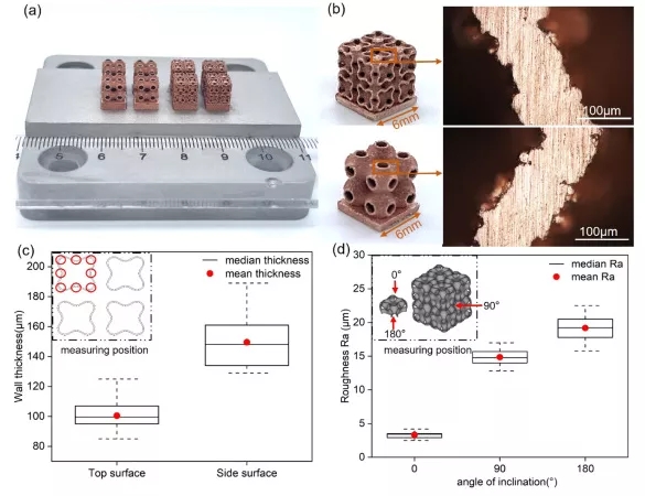 hp-LPBF 的最小頂壁厚度為 100 μm,用于打印復(fù)雜的純銅部件。最小側(cè)壁厚度為 149 μm,頂/側(cè)/底表面粗糙度顯示 Ra 為 3.3/14.8/19.2 μm。與打印純銅的其他增材制造技術(shù)相比,hp-LPBF 具有高分辨率和低粗糙度的綜合處理能力。