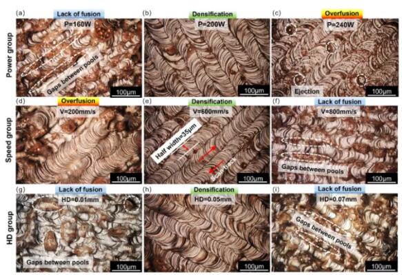 在低功率下打印高反射組件是一種有吸引力的替代方案。通過減小激光光斑、切片層厚度和粉末尺寸,同時保持激光體積能量密度,低功率激光可用于制造完全致密的部件。據(jù)報道,較小的銅粉能夠吸收更多的激光能量。因此,進(jìn)一步同時減小激光光斑尺寸、粉末尺寸和打印層厚是正確的方向。圖1。(a)薄壁的制作方法(b),(c) 基板上所有薄壁樣品的制作結(jié)果和分類 (d)-(f) 側(cè)面,以及 (g)-(i) 頂面LOF ,分別為致密化和過度融合樣品。圖2 (a), (b) 不同參數(shù)組制作的頂/側(cè)面粗糙度Ra (c), (d) 寬度/深度與LED的關(guān)系及擬合結(jié)果。圖3 (ac) LOF 側(cè)表面的微觀結(jié)構(gòu),(df, i)致密化,(gh) 過度融合,(j) 不同參數(shù)組的樣品分類。圖5 不同參數(shù)下熔池形態(tài)的變化,(a)-(c)功率組,(d)-(f)速度組,(g)-(i)HD組。圖 7 (a)熱處理后樣品的電導(dǎo)率,(b) 熱處理后樣品的晶粒尺寸,(c)不同側(cè)面微觀結(jié)構(gòu)的光學(xué)顯微照片,底部說明了它們對應(yīng)的晶粒尺寸。圖 8 (a) 壁厚為 100 μm 的增材制造TPMS結(jié)構(gòu) (b) TPMS 壁的橫截面微觀形貌,(c) 頂/側(cè)表面的壁厚 (d) 頂/側(cè)/底表面粗糙度 Ra。圖 9 (a) 線性/體積能量密度表示的工藝窗口(b) 不同HD的最小LED和吸收率的理論計算結(jié)果。