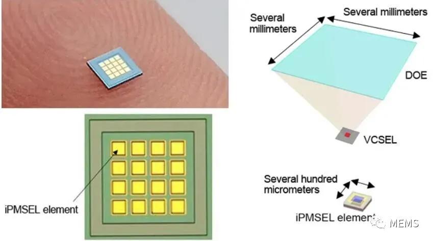 左圖:iPMSEL陣列由16個發(fā)光單元組成。右圖:由VCSEL、DOE和iPMSEL陣列組成的光束模式光源概念圖。