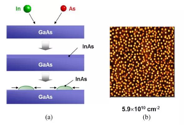 圖1 InAs量子點于GaAs襯底上的外延生長流程及其在原子力顯微鏡下的單層結(jié)構圖。來源[1]。