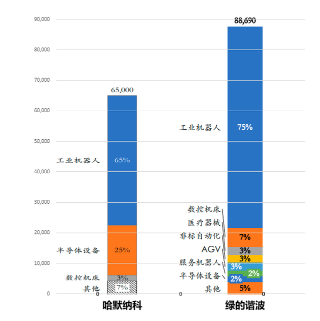 在哈默納科2019年全球下游市場營收分布中,工業(yè)機器人雖然占比仍然最高,但數(shù)值上僅有44.9%,半導體制造設備(21.7%)和其他高端應用領域共同占比接近40%。