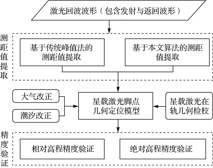 本文采用控制變量法,在僅改變激光測距值條件下進行激光腳點高程計算,對比在不同測距值下的高程精度。首先,根據(jù)星載激光在軌幾何定位原理,考慮大氣[22-23]、潮汐[24-25]引起的測距誤差,構(gòu)建嚴密幾何定位模型[4];然后,利用一般峰值法與本文方法提取的測距值分別計算激光點高程;最后,利用平靜湖面、冰面及高精度LiDAR數(shù)據(jù),進行兩類測距值的激光點高程相對精度與絕對精度對比。其流程如圖 6所示。
