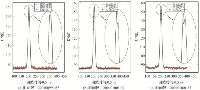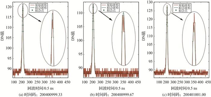 針對以上6種不同的情況下的波形,由整體結(jié)果可以看出,本文算法均能準確地擬合出回波波形,其中每類波形脈寬吻合度極高,擬合波形峰值與實際回波最大值點幅值相當(dāng)。從擬合波形細節(jié)觀察,本文算法避開了各種情況下的原始波形中噪聲點;且在上述6種典型波形情況下,擬合后波形峰值均能位于原始波形幅值最大的兩個采樣點之間。充分說明本文算法能夠有效地擬合出實際波形的峰值,抑制激光發(fā)射與回波波形中噪聲,從而可根據(jù)擬合后的波峰即可精確獲取激光發(fā)射或返回波形時刻。