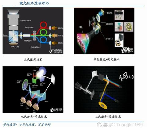 混合光源三種。隨著激光顯示技術(shù)的發(fā)展,各投影廠商已推出多款激光顯示解決方案。目前市場(chǎng)上主要以三基色 RGB 激光光源、熒光粉 + 激光、激光 +LED 混合光源為主。其中,三基色 RGB 激光光源以海信視像為代表,熒光粉 + 激光以光峰的 ALPD 技術(shù)為代表。