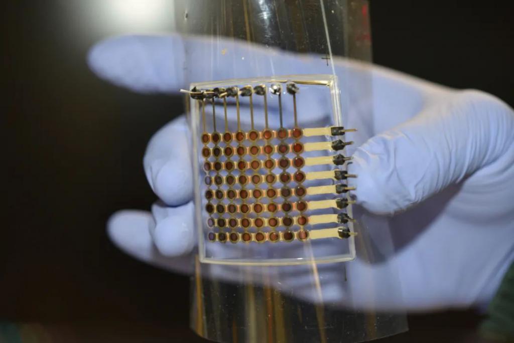 如下圖所示,為提高打印的自動化程度,蘇瑞濤設計了陽極和陰極導線縱橫交錯的陣列結構,并采用可打印性極高的銀顆粒導電膠作為陰極導線。