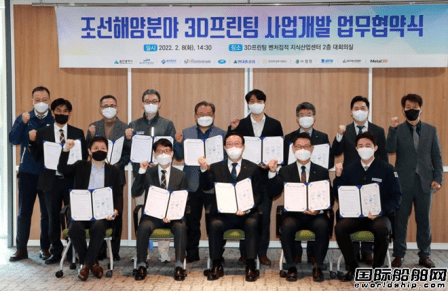 2月8日,韓國蔚山信息產業(yè)振興院(UIPA)、韓國生產技術研究院(KITECH)、韓國3D打印融合技術協(xié)會、韓國船級社(KR)、現(xiàn)代重工、Hankook Steel co.,LTD等11家相關機構和企業(yè)齊聚在韓國造船重鎮(zhèn)——蔚山市3D打印風險聚集知識產業(yè)中心,簽訂了“造船海洋領域3D打印事業(yè)開發(fā)業(yè)務協(xié)議”。