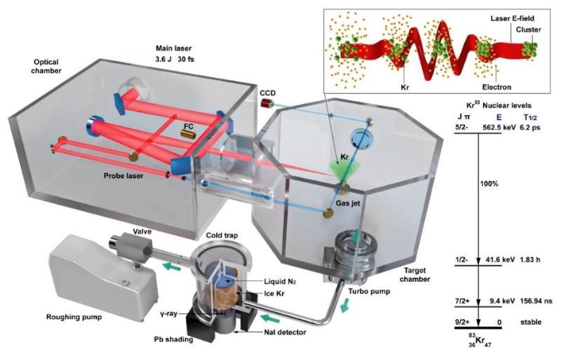 近期,上海交通大學張杰院士團隊的陳黎明教授,與復旦大學馬余剛院士團隊的符長波教授合作,將激光等離子體應用于核物理研究。他們利用激光等離子體的極高密度的特點,通過激光和近固體密度氪(Kr)團簇的非線性共振加熱獲得高密度MeV能量的電子,首次實現了高密度快速振蕩的電子在數十飛秒內庫倫激發(fā)83Kr原子核。對應2.34×1015p/s的超高峰值效率激發(fā)核同質異能態(tài)83mKr3,其泵浦效率高于傳統(tǒng)加速器約5個量級,從而克服了傳統(tǒng)激發(fā)方式較低密度的弱點。該工作成為短壽命核同質異能素超快激發(fā)的首次實驗驗證,從而開啟了激光“等離子體激發(fā)器”這種全新的核激發(fā)方式,可廣泛應用于各種核激發(fā)與核合成的研究與應用。
