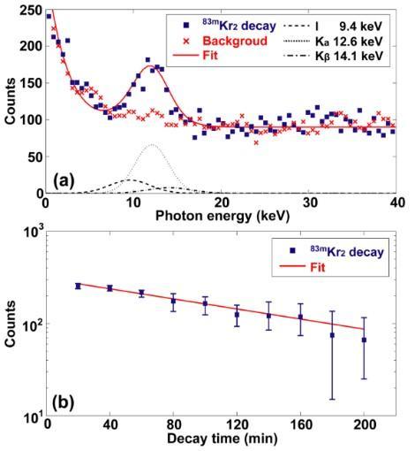 圖 2. (a) 同質異能態(tài)退激釋放的X射線譜;(b) 隨時間衰變的產額及半衰期擬合。