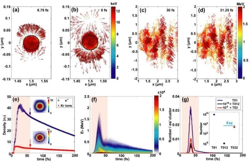 圖 3. 激光團簇作用的PIC模擬及庫倫激發(fā)計算。(a-d) 不同時刻激光團簇作用的電子分布;(e) 團簇區(qū)域電子、離子密度隨時間的演化;(f) 團簇區(qū)域電子能量隨時間的演化;(g) 各個激發(fā)路徑的激發(fā)效率及產額。