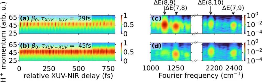如上圖 (c)和(d)所示的量子拍的強(qiáng)度作為XUV-XUV延遲的函數(shù)。來源:Fig. MBI