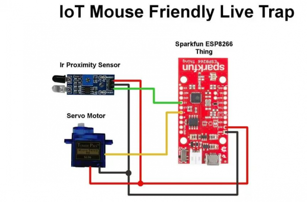 這是捕獲小獸而不傷害它們的陷阱,因此您可以將它們釋放到外面。如果接近傳感器檢測到老鼠,伺服電機將關(guān)閉門。您將收到即時消息或電子郵件,通知您捕獲了它。當您不在家或不遠時,無論您身在何處,都可以打開陷阱。