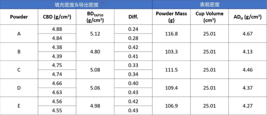 ■顆粒密度數(shù)據(jù)顯示,粉末A和粉末C是選擇中最密集的顆粒,固結(jié)輕敲后的體積密度(BD50Taps)表明兩者也具有最高的填充效率
