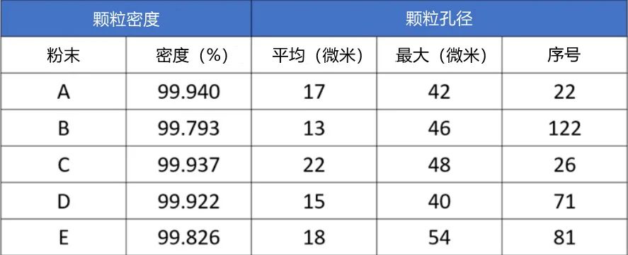 ■粉末A和粉末C產(chǎn)生的毛孔比其他粉末稍大,但它們產(chǎn)生的毛孔數(shù)量要少得多
