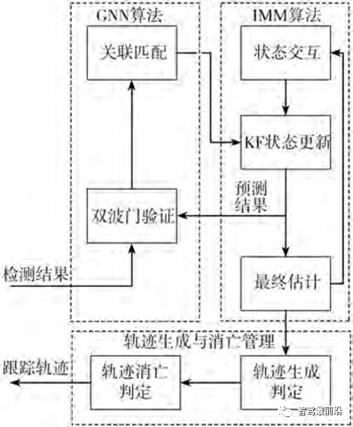 本文中提出的基于激光雷達的3D實時車輛跟蹤系統(tǒng),由3個部分組成:(1)使用雙波門GNN的前后幀目標關(guān)聯(lián)模塊;(2)使用3DKF實現(xiàn)的IMM跟蹤濾波器;(3)結(jié)合歷史軌跡信息的跟蹤軌跡生成和消亡管理器。其整體系統(tǒng)流程如圖1所示。