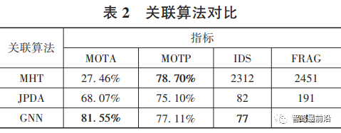 對比不同的關(guān)聯(lián)算法,其結(jié)果如表2所示。從中可以看出,使用GNN使得MOTA有了極大的提升,同時也實現(xiàn)了IDS與FRAG最小,僅在MOTP指標上較差。正如在1.2節(jié)中所述,在獲得3D檢測結(jié)果后,干擾有了較大的衰減,因此不考慮干擾的GNN關(guān)聯(lián)算法反而更加適應(yīng)此種情況,可以獲得更好的關(guān)聯(lián)結(jié)果。