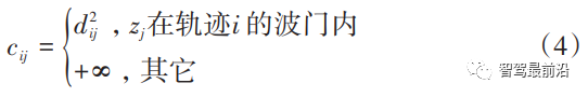 隨后使用馬氏距離作為馬氏波門的閾值 γm,對滿足歐式波門的檢測結(jié)果再進行馬氏距離的計算,濾除符合歐式波門但不符合馬氏波門的檢測。