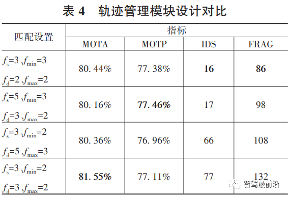 在軌跡管理模塊中對比了不同的fs與fmin、fd與fmax參數(shù)值對精度的影響,其結(jié)果如表4所示。對比表4后3組實驗可知,增大對歷史軌跡的判斷范圍,即使軌跡生成和消亡的總體判定比fmin/fs與fmax/fd從2/3下降到3/5,仍可減小IDS與FRAG。而在合適的fs與fd設(shè)置下,將fmin/fs與fmax/fd升至1,如第1組實驗,即可獲得最小的IDS與FRAG。