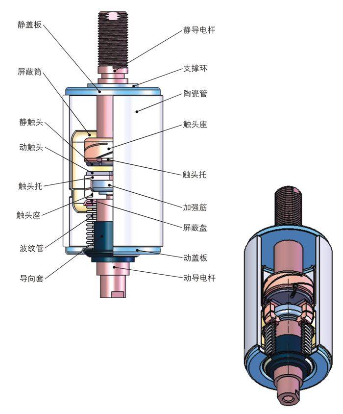 由玻璃或陶瓷制成的氣密絕緣外殼、動端蓋板、定端蓋板,不銹鋼波紋管組成了氣密絕緣系統(tǒng)。為了保證玻璃、陶瓷與金屬之間有良好的氣密性,除了要求材料本身的透氣性盡量小和內部放氣量限制到極小值,還對封接時要有嚴格的操作工藝。