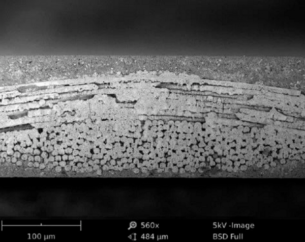 利用激光器在 500 kHz 脈沖重復(fù)頻率 (PRF) 下的 50 W 額定輸出,以及在 4 m/s 的掃描速度下優(yōu)化的高速多次工藝,可使有效切割速度達(dá)到 83 mm/s。入射面顯示僅有少量的碎片沉積,并形成了一個約 10 μm 的明顯熱影響區(qū) (HAZ)。通過 SEM 成像查看橫截面(圖 2)時,圖像顯示出這是一次高質(zhì)量的切割,可清楚地看到每一根纖維,且只有輕微的熔化跡象