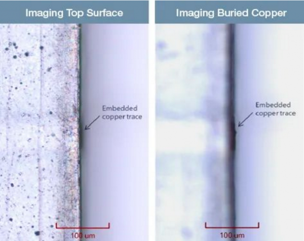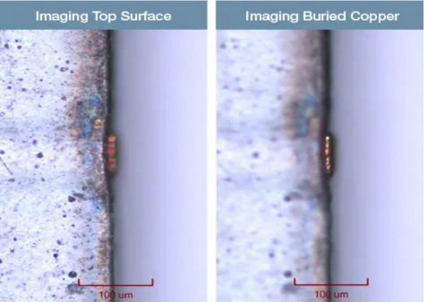 結(jié)果表明,這樣的做法頗有成效。在全功率運(yùn)行激光器以進(jìn)行高速加工的情況下,切割入射面的俯視顯微鏡照片(圖 4)表明,內(nèi)嵌銅線確實(shí)對切割質(zhì)量有一定的影響。雖然表面質(zhì)量總體優(yōu)秀,切邊質(zhì)量良好,并且僅有一個小的碎片區(qū),但有證據(jù)表明,銅層周圍的過度加熱導(dǎo)致其周圍的聚合物 FR4 材料被輕微侵蝕,從而導(dǎo)致銅線從側(cè)壁輕微突出。該工藝的有效切割速度為 57 mm/s。