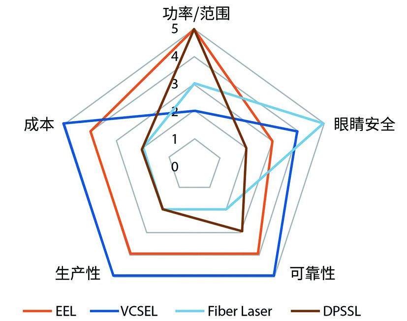 與EEL和VCSE相比,固態(tài)和光纖激光器在短波紅外范圍內(nèi)提供相對(duì)更高的脈沖能量、對(duì)人眼安全的發(fā)射以及更高的光束質(zhì)量。但后兩種激光技術(shù)另有優(yōu)勢(shì)。