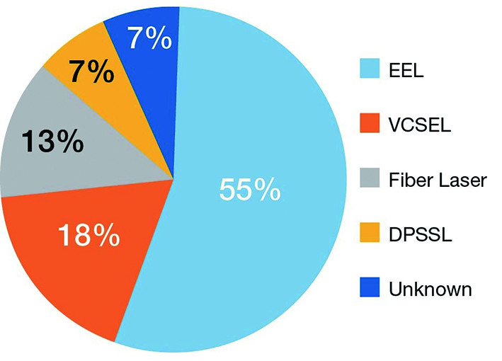 EEL和VCSEL主要基于砷化鎵(GaAs)化合物,是主要在近紅外波長(zhǎng)(例如905nm、940nm)下工作的半導(dǎo)體激光器,以卓越的轉(zhuǎn)換效率、簡(jiǎn)單性和與汽車標(biāo)準(zhǔn)的兼容性而聞名,并且適用于與其他激光雷達(dá)源相比,提供更緊湊的外形尺寸。因此,半導(dǎo)體激光技術(shù)在汽車激光雷達(dá)市場(chǎng)中占有很高的市場(chǎng)份額,其中又以EEL占據(jù)了主導(dǎo)份額。