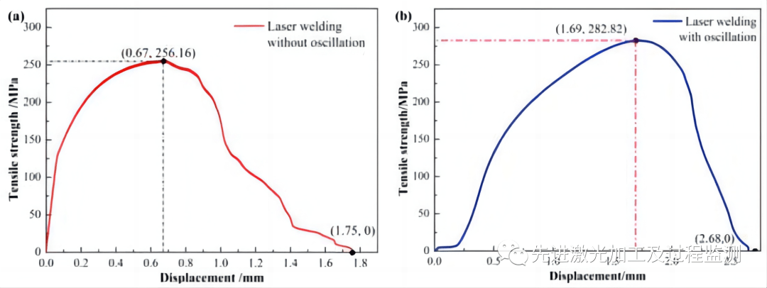 圖7 純銅/不銹鋼激光焊接時(shí),加入環(huán)形光束振蕩。(a)沒有加入光束振蕩的焊接微觀結(jié)構(gòu)以及焊接接頭抗拉強(qiáng)度曲線,(b)加入振幅為0.5mm,頻率為250Hz的環(huán)形光束振蕩,焊接微觀結(jié)構(gòu)以及焊接接頭抗拉強(qiáng)度曲線。