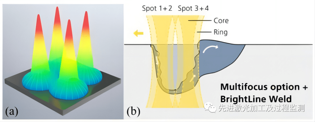 圖9 鋁/鋁接頭時(shí)在光束振蕩的基礎(chǔ)上加入光束整形,將單個(gè)激光光斑分成四個(gè)功率相等的單光束。(a)多聚焦形成的四個(gè)光斑的激光功率分布示意圖;(b)激光光斑作用于熔池的示意圖; (c)單點(diǎn)焦點(diǎn)光束焊接。(d)多焦點(diǎn)光束焊接 [紅色:當(dāng)前鎖孔大小;綠色:當(dāng)前熔池大小]。