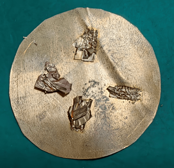 (1)大圓柱電池負(fù)極集流盤(pán)焊接,焊接方式:銅-銅箔疊焊;焊接材料:0.2mm紫銅和30層6um銅箔: