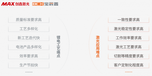 當前,全球新能源汽車產(chǎn)業(yè)已進入加速發(fā)展新階段,對動力電池技術(shù)創(chuàng)新、質(zhì)量性能等提出更高的要求。接下來,動力電池行業(yè)將邁入從“有沒有”到“好不好”的新階段。動力電池產(chǎn)業(yè)的前半程,已經(jīng)可以滿足市場的基礎(chǔ)需求。動力電池產(chǎn)業(yè)的后半程,是引領(lǐng)市場需求,從有到好,與產(chǎn)業(yè)一起邁向高質(zhì)量躍升發(fā)展的新階段。要在動力電池的生產(chǎn)制造中實現(xiàn)高標準制造,無論是鋰電工藝本身還是激光應(yīng)用落地都存在著許多亟需解決的問題:動力電池的質(zhì)量標準要求高,工藝多樣化,新工藝迭代快,電池產(chǎn)品多樣化等,都給電池生產(chǎn)帶來了諸多挑戰(zhàn)。在激光應(yīng)用落地過程中,一致性、穩(wěn)定性、效率、精度等要求高也是工藝難點。