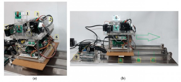 除草裝置的原型。(a) 1. 指向攝像頭;2.振鏡;3.樹莓派計(jì)算機(jī);4.激光測距儀;5.激光器;6.電源;7.電機(jī)驅(qū)動器;8.電子信號處理板;9.控制激光裝置位置的 Arduino 板。(b) A、B 和 C 顯示了作物的位置。資料來源:Rakhmatulin, I.,  Andreasen, C.,《A concept of a compact and inexpensive device for controlling weeds with laser beams》,《Agronomy》(2020)。