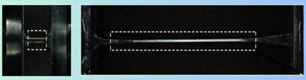 “超級(jí)橡皮筋”拉伸前后對(duì)比圖。左圖為拉伸前,右圖為拉伸后。
