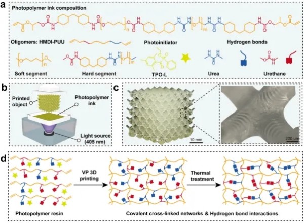 科研人員提出一種多重氫鍵誘導(dǎo)的雙交聯(lián)策略,以實(shí)現(xiàn)光固化3D打印高性能聚氨酯,即設(shè)計(jì)制備含脲基的光敏預(yù)聚物,在快速光固化形成共價(jià)交聯(lián)網(wǎng)絡(luò)的基礎(chǔ)上,通過多重氫鍵形成的交聯(lián)網(wǎng)絡(luò)的協(xié)同作用,克服機(jī)械性能和可加工性之間的矛盾,實(shí)現(xiàn)高性能聚氨酯彈性體的高精度成形。