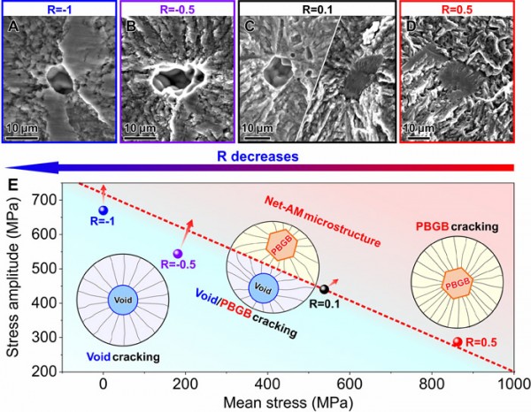 在本項(xiàng)研究中,面對(duì)這個(gè)更復(fù)雜的難題,研究團(tuán)隊(duì)分析揭示出鈦合金中幾種容易導(dǎo)致疲勞開裂的薄弱環(huán)節(jié),以及它們?cè)谀姆N受力模式下會(huì)“發(fā)作”。在此基礎(chǔ)上,研究團(tuán)隊(duì)利用NAMP工藝制造了近乎無(wú)孔洞的3D打印組織,可以同時(shí)優(yōu)化所有這些薄弱環(huán)節(jié),這種3D打印鈦合金具備在全應(yīng)力比條件下都保持高疲勞強(qiáng)度的特性。