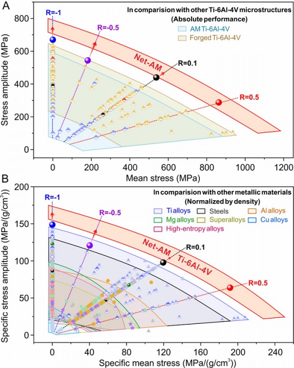與其他Ti-6Al-4V合金和常見的金屬結(jié)構(gòu)材料相比,Net-AM組織Ti-6Al-4V合金在不同應(yīng)力比下的疲勞強(qiáng)度分布
