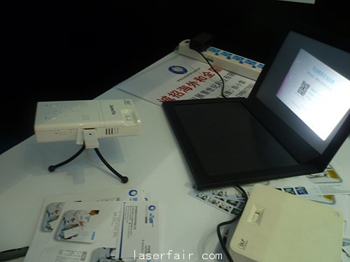 這是一款無線投影儀,雖然分辨率并不算高,但是勝在體積小,而且免去了數(shù)據(jù)線。具體效果請(qǐng)看圖中筆記本的屏幕。
